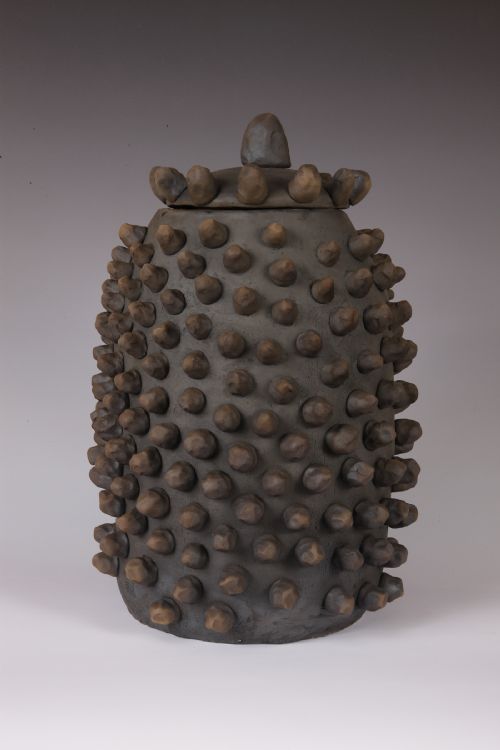 Description: Covered jar Raku and smoke fired to cone 04.