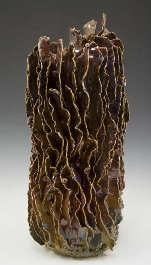 | Description: | Coil built vase with attachments of thin slabs for coral like texture. Variety of glazes were used with sprayed application. White stoneware fired to cone 6. |