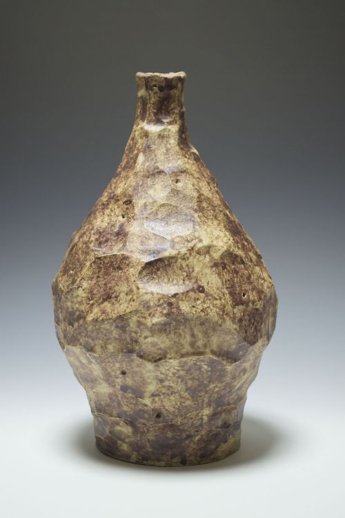 | Description: | Coil built vase, faceted, stained with iron oxide wash |