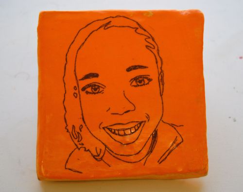| Description: | Naomi took a selfie with the iPAD, and then traced it on a lightbox with a Sharpie. Next, I made a reduced copy of her drawing and made a decal on a printer that has iron oxide in the ink. Finally, she afixed the decal on the hand-cut tile that she had glazed, and we fired it at cone 01 for the last decal firing. |