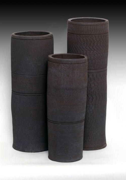 | Description: | these are 3 dark brown cylinder stacks, which added texture all the way from the bottom to the top. They where reduction cooled at a cone 10 natural gas kiln. |