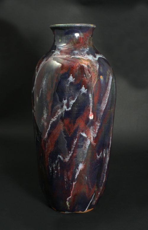 | Description: | Stoneware thrown in sections and assembled. Glaze sprayed then covered with drip patterns. |