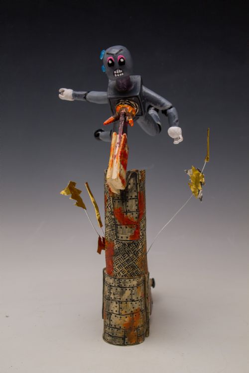 | Description: | Humanity's abusiveness was my main thought when bringing this piece to life. The determination of everything humanity makes, including people, and the loyalty was signified through the usage of an individual robot which I deemed a common symbol of humanity's servant. I believe that we go through cycles of materials that we hold to fit our needs and even though all we do is use and take in, we betray it all by throwing it away without another thought. I guess the robot is a personification for the forced loyalty that materials have to fit our needs and the man-made blaster shows the betrayal when we toss things to oblivion. Ceramic, cone 6 glaze, cold finish oil paint, mixed media, hardware engineering |