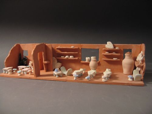 | Description: | Architectural sculpture of a pottery with hand sculpted furnishing and equipment, wheels, tables, potters stools as well as miniature pots formed on the wheel in redware and white earthenware. |