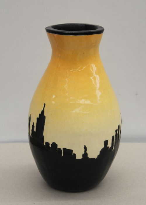 | Description: | Coil hand built pot with incised skyline and underglaze spray ombre and black city line. |