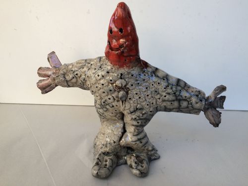 | Description: | The project begins with rolled out slab. Students then use a template to trace around the shirt pattern. Students decorate the surface with press molds, textures or sprigs. Newspaper is rolled up and placed on one side of the flipped clay shirt. It now can stand up, allowing students to construct head, slip coiled hands or ams in the arm holes. All of this requires slipping and scoring. Additions can be added - hats / hands / embellishments of all kinds. |