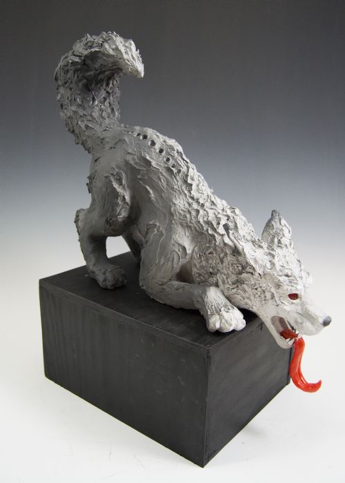 | Description: | Wolf was made with cone 6 stoneware and painted with latex house paint. Eyes and tongue are made from cast glass. Wolf is set on a wood base. This piece lights up with light emitting from the mouth and holes in the back. |