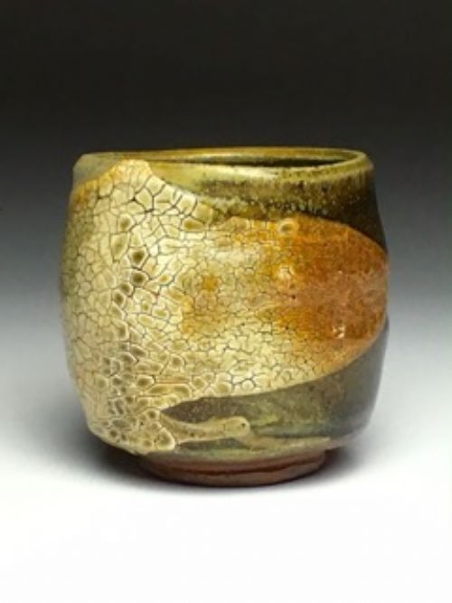 | Description: | Wood fired tea bowl made from 470 Standard wood fire clay. The piece was coated with a white crackle slip. The cracked slip resembles the scales of a crocodile. |