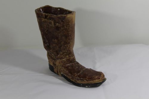 | Description: | This piece was made using low-fired earthenware. The assignment for this piece was to choose a shoe and make a realistic looking replica of it. I was interested in the details of the boot, specifically the straps and the stitching, and also the texture, which was leather. The boot I choose was also old and a little damaged, so I wanted to recreate the folds and bumps in the material. To make the boot more interesting, I added some color on the heel. |