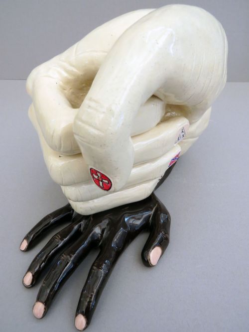 | Description: | The large fist represents the white oppression that has plagued this country for generations. The nails are incised with common symbols of white supremacy. The smaller black hand shows the oppression of colored people and the unforgivable moral wrongs that racism has caused. Together the hands show the bias that has been instilled in this country and the need for racism to be erased. |