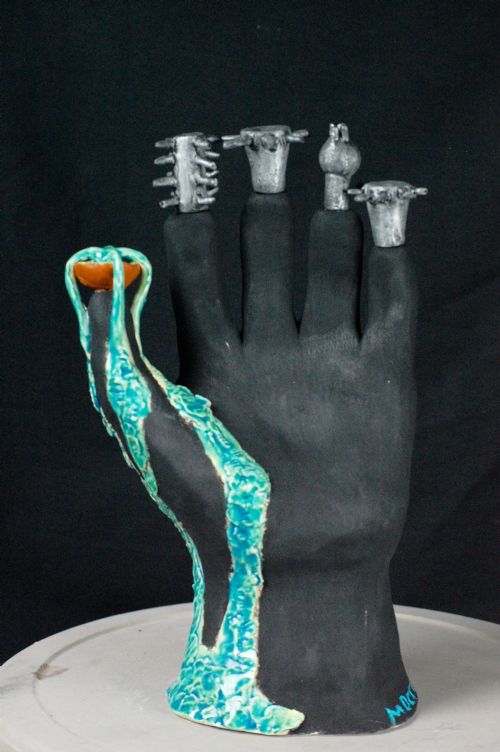 | Description: | The one thing that inspired me to make my hand the way I did is Kansas City itself. I wanted to make this piece resemble Kansas City as much as possible but still try to keep it simple. On the 4 fingers i have the Bartle Hall sky station (originally sculpted by R.M. Fischer), I got the idea to do this the day our sculpture class went on a field trip to different art galleries around the Kansas City area. On the thumb I have sculpted a fountain because Kansas City is known as the city of fountains and it has around 200 fountains around the metro area. On the right side of the hand i have the roman numeral “MDCCCXXXVIII” and this stands for the year that Kansas City was formed which was 1838. |