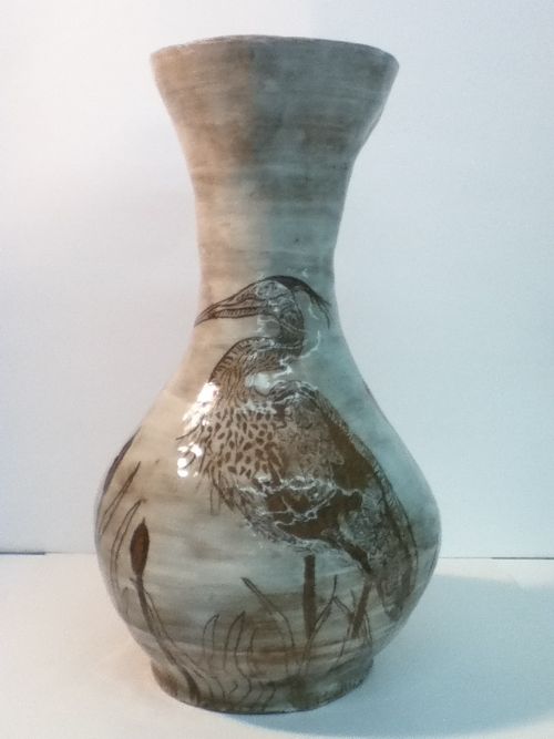 | Description: | Representing the ability to progress and evolve, Blue Herons send a message to people about self-reliance. After constructing the slab coil vase, porcelain slip was applied to the surface. Once the slip dried the blue herons were carefully carved through the slip. After the birds were completed their ecosystem was carved into place. This vase also displays the strength and pride of being an individual and standing alone. |