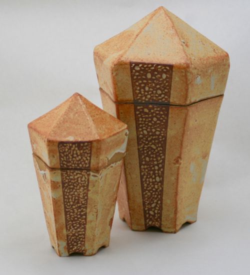 | Description: | Pair of hand-built boxes. Stoneware, slip, Shino glaze fired to cone 10 in reduction. Dimensions given for larger box. |