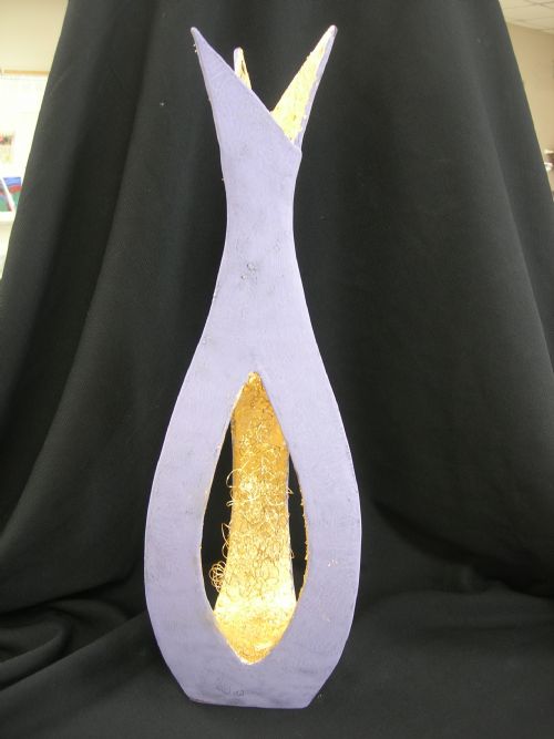 | Description: | Hand Built Purple (glaze) and Gold (gold leaf) with gold colored wire in middle negative space |
