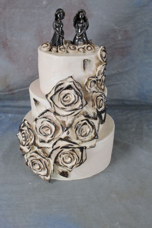 | Description: | A life size wedding cake celebrating a Lesbian union. Created using stoneware, amaco mixed underglazes, and Amaco Luster Gold glaze. |