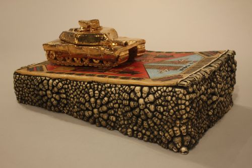 | Description: | This piece is slab built with sprigged faces on the sides, incised designs on the top, and a slab built tank fired with gold lustre. The tank works as a teapot. |