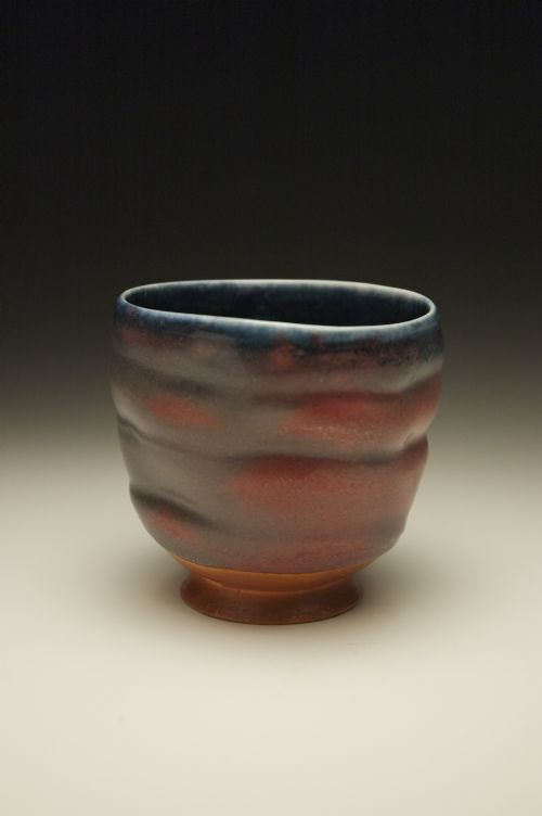 | Description: | Thrown and altered porcelain tea bowl. Copper red glaze exterior, dark blue to black glaze interior, orange flashing slip at foot. Fired to cone 10. |