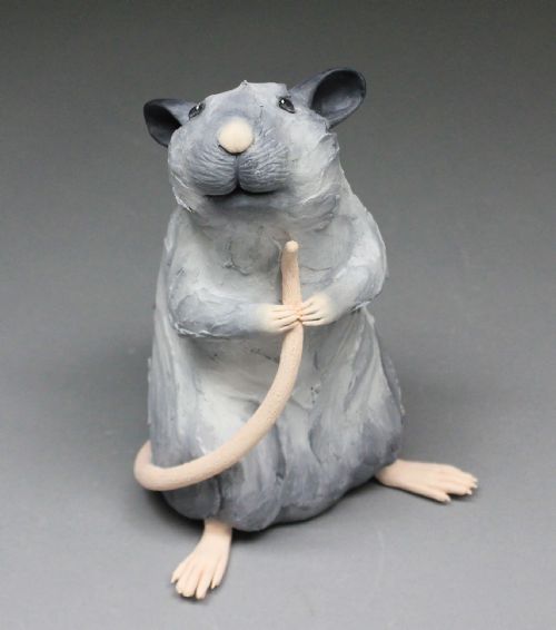 | Description: | I had a lot of fun with this little sculpture of a rat, from creating the organic, loose fur texture to whittling the tiny nails. I was influenced by Beth Cavener Stichter's textures and liveliness of her animal sculptures. For this piece, I used flat interior latex paint to create the subtleties in the fur's blended gradient. |