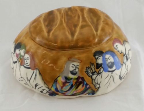 Description: I was inspired by Leonardo da Vinci's painting of The Last Supper. The lidded vessel was hand built to look like a loaf of bread. The figures are painted free-hand using various colors of under glaze. After being fired once, a clear glaze and a semi-transparent brown glaze were applied.