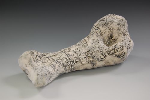 | Description: | A sculpture of a cow leg bone with slip trailing designs. Glazed with rustic black and white. |