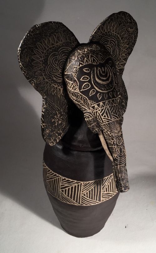 | Description: | This is an animal inspired covered jar done as her first coil pot in Ceramics and Pottery I. The students were asked to explore possible spirit animals and then given the open ended problem of creatively incorporating their animal into a coil project. The piece is constructed with a cone 6 stoneware. It's painted with Natural Black Engobe and the lines are Sgraffitoed into the surface. |