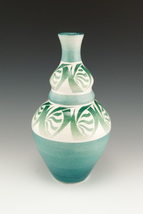 | Description: | Porcelain bottle with air brushed watercolor underglaze with masked tape design. |