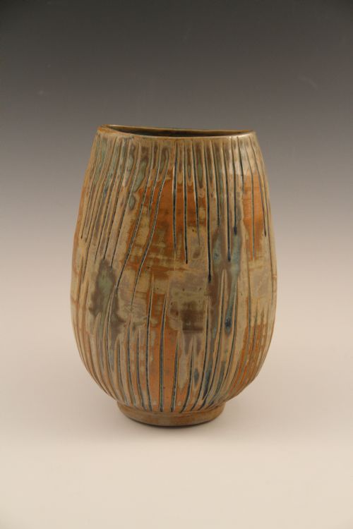 | Description: | Wheel thrown and altered vase, with hand carved texture. |