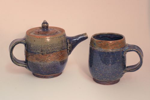 | Description: | Stoneware teapot and mug sized for a personal serving of tea. Slip decoration, handles pulled from pots. Fired to cone 10 in reduction. Measurements for teapot. |