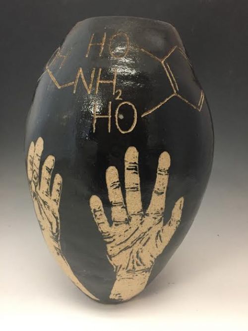 | Description: | Serotonin. Dopamine. Norepinephrine. These are the chemical compounds, which, once released in the brain, comprise what mankind has labeled as "love". Reduced to a simple representation of their chemical structure, I have distilled love down to its most cerebral, factual, detached state. In doing so, the urgent grasping of the hands from below seems, at best, a waste of time. Love is hugely idealized; movies and songs and novels teach us from a young age to expect a whirlwind romance with few complications, which , once overcome, allow us to live happily ever after with our one true love. The world shows us over and over how to fall in love, but reveals very little about remaining in love. Thus, man reaches for the ghost of reality, a nonentity that he can never realize because it doesn't exist. Love is not worth pursuing. (Piece is constructed using hand-rolled coils, painted with engobe and sgraffitto carved.) |