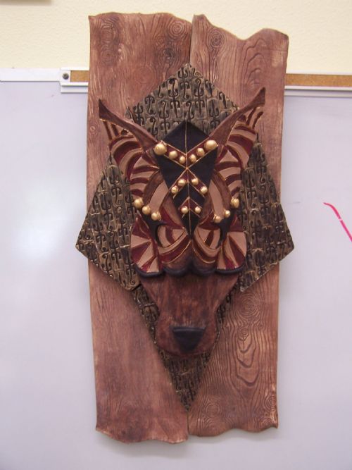 | Description: | Ceramic tribal like mask glued on top of black tiles that are glued on top of two ceramic tiles that look like wood planks. |