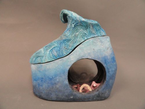 | Description: | Hand built using slabs, pinch and coil methods. The shoe was pinched, and the waves were carved into the top shoe, the bottom part of the shoe was build separately with slabs. The octopus was pinched and coiled and added into the bottom Glass was hand cut by student and glued in the oval openings. LED lights were added to the bottom of the show, so when it was put together light shown down into the shoe on o the octopus. This sculpture is to draw attention to the fact that pollution is killing our coral reefs and the octopus is taking refuge in the shoe. The total fantasy shoe and octopus was hand painted using room temperature glaze( acrylic paint) with glitter added for effect |