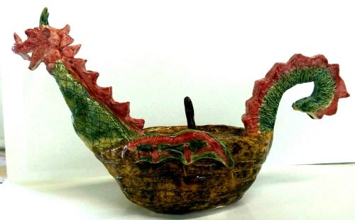 | Description: | Julia designed her teapot after a favorite book which featured a boat shaped like a dragon. The boat's deck has an opening for water to be added. |