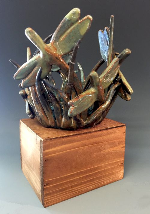 | Description: | Cone 5 Clay Sculpture of grass and dragonflies. Dynamic with positive and negative space. |