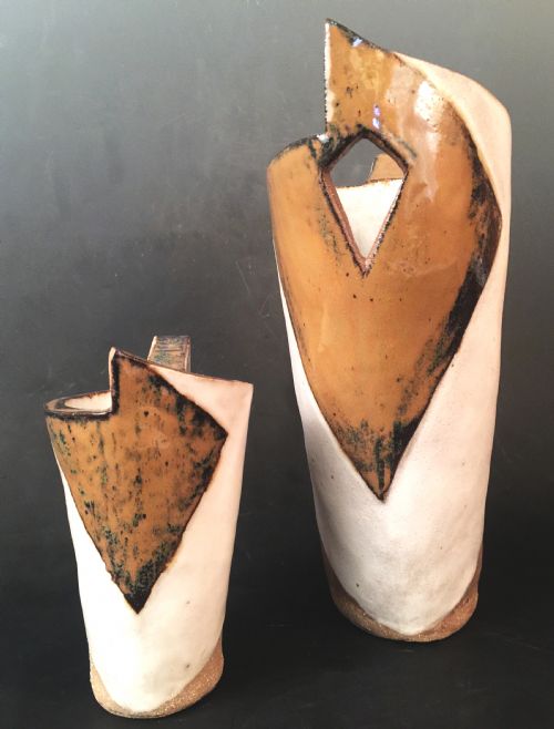 | Description: | Slab built sculptural pitcher and cup form with geometric construction and glaze work. |