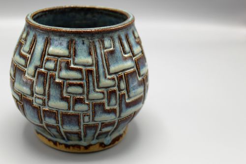Description: A jar with carved geometric shapes all around that are different sizes. With the glaze added it fluxes in the areas that I carved.