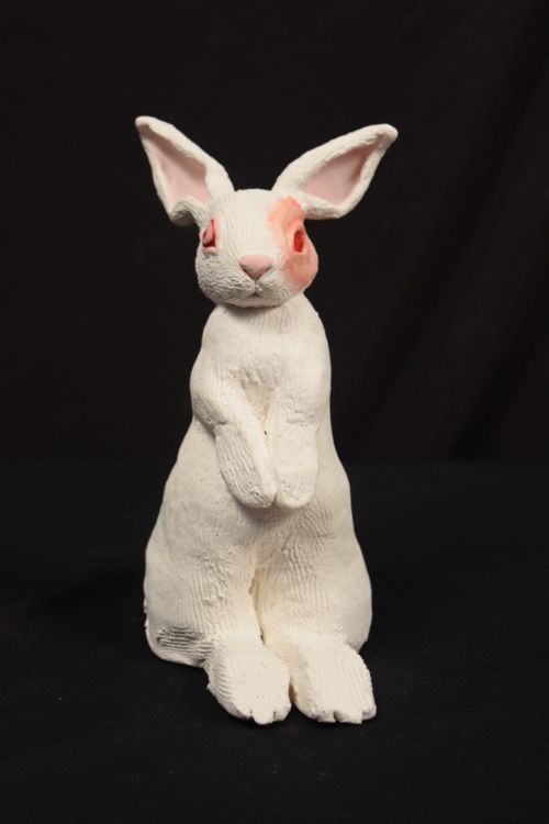 | Description: | Stoneware hand sculpted rabbit with a missing eye from a chemical burn. This piece explores the realities of animal testing. |