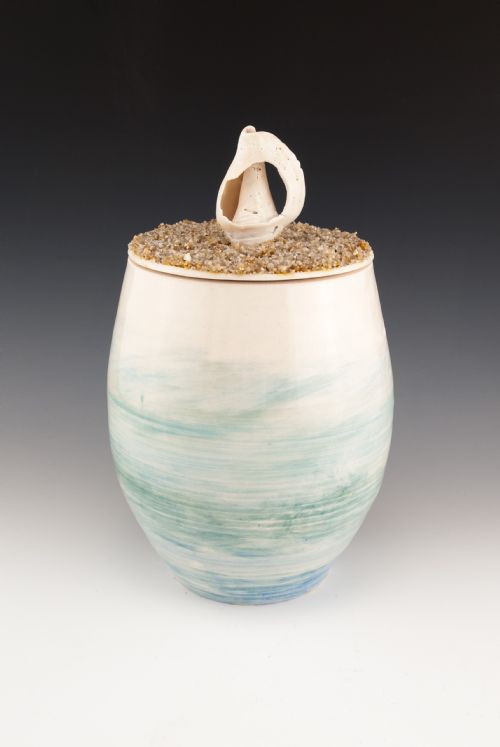 | Description: | This porcelain covered container is topped with a layer of textured sand and a seashell brought back from a family trip. The lower portion is covered in a Semi-moist underglaze wash. |