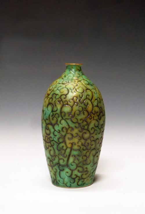 | Description: | A copper patina jar with enameled gold rim and exterior covered in carved floral patterns |