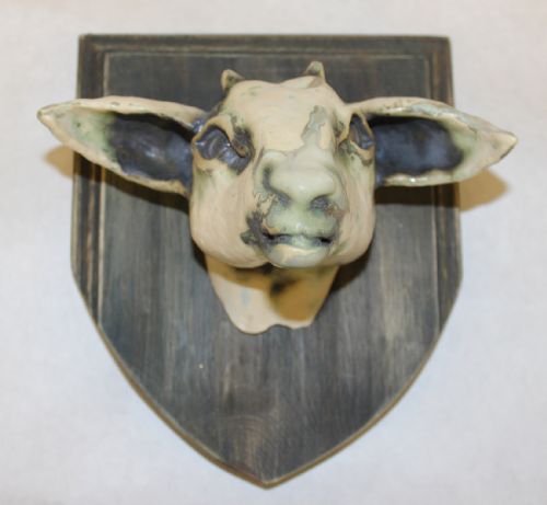 | Description: | Sculpted goat head mounted on a wood plaque. |