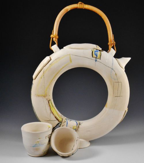 | Description: | Wheel thrown teapot and cups, decorated with underglaze pencils |
