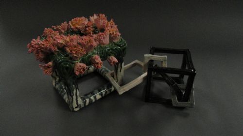 | Description: | Hand built interlocking square chains with extruded bars interlocking each other. The interlocking cubes of cay are free from each other. The largest main cube has hand build flowers across the top. the size of the sculpture varies as to the placement of the interlocking cube forms. |