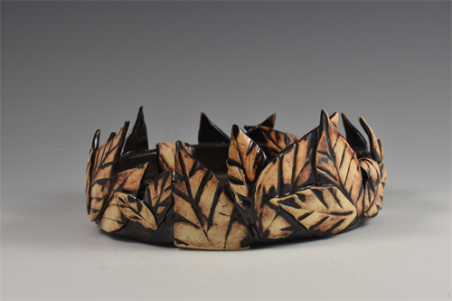 | Description: | Shallow platter, decorated with applied leaves. Glaze wiped back on leaves to create raw, "toasted" effect. |