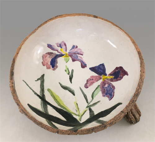 | Description: | Handbuilt, stoneware clay, majolica glaze, carved, iron oxide tinted, and underglaze painted |