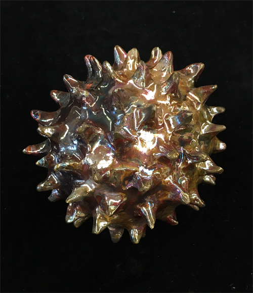 | Description: | Spiny Raku Orb was made by joining two pinch pots, forming a dorodango-like orb, and then painstakingly adding each individual spine. The resulting sculpture is sea-form like. The copper raku glaze highlights the texture and gives it an other-worldly metallic patina. |