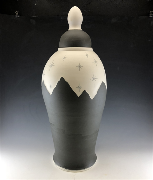 | Description: | Wheel-thrown porcelain with black engobe, wax resist reduction design, inspired by Utah mountains. |
