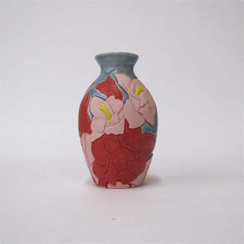 | Description: | Wheel thrown, relief carved the top design and line carved the bottom design, Amaco Velvet underglazes on the relief carving and Amaco satin red cone 6 glaze |