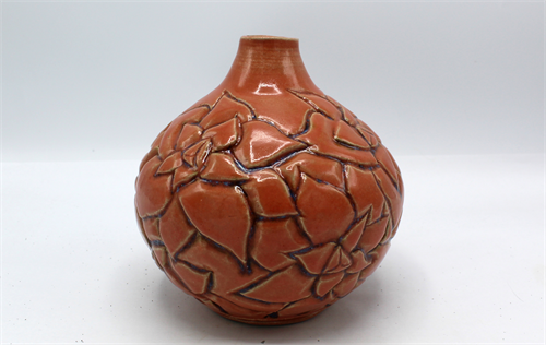 | Description: | In my Flower Bottle, I threw a bottle form and created the belly by doing outward pulls. Then, I created the neck by doing a series of collars until I got my desired shape. When the piece was leather hard, I threw a chuck to trim a foot. A problem I had to solve was controlling the drying of my piece in order to keep it leather hard. The design of my piece began with drawings of flowers which I emphasized with subtractive carving. The texture from the flower creates movement throughout the piece, forcing the viewer’s eyes to move about the piece. To accented the texture by inlaying celestial blue and I used a celadon glaze over the top to allow the blue to contrast the orange from the poppy glaze. This helped make the texture the focal point of the piece because blue and orange are complementary colors. |