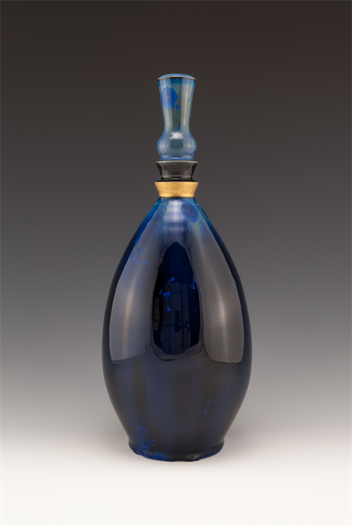 | Description: | wheel thrown bottle with crystalline glaze , carved to get steps in neck and gold around neck to give it attention. |