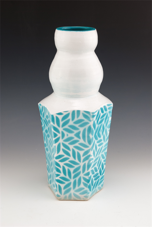 | Description: | Combination of handbuilt and wheel thrown elements. Underglazes were applied with an airbrush spraying through a cut paper mask create the resulting pattern. |