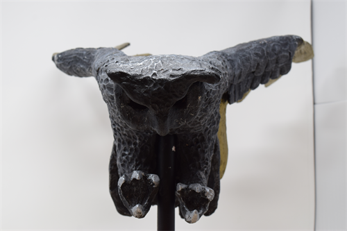 | Description: | When deciding what to make for a sculpture I went with one of my favorite animals. I have always loved owls and multiple online tests have stated that my spirit animal is an owl, so naturally that's what I chose. I knew the main problem with creating an owl from clay would be the wings, so I decided that I would have to make the body and the wings separately. I first started with the body by just blocking out the basic shapes for the head, body, legs and tail. It was hard to get the proportions right because every picture I looked at was different, but I was able to find a few that showed the anatomical structure and structure of the muscles. After I had blocked out the basic shapes I started taking off clay and basically "carving" the shape of the owl out of the blocks that I had to work with. I have always loved carving, so this was easy for me. After I had a decently proportionate body, head, legs, and tail for the owl, I moved onto the wings. The main part I needed to get right was the curve of the wings. I knew I wanted the owl to be diving in to get its prey so I sat the body up on a piece of pvc pipe in the position it would have in flight. I then made rods for where the bone structure of the wings would be and waited for them to dry to a point where they would hold shape, but also be malleable. One they both got to this point I held them up to where the wings would protrude from the owl and shaped them appropriately. After they were shaped I sat them up on foam for them to dry even further so they would hold their shape. While they were drying I started hollowing out the owl. While hollowing I had accidently poked some holes into him including where the eyes were at. Instead of trying to put eyes back in I took them out all together. Once the hollowing was complete I started on detailing. For the detailing I used a loop tool to carve out little indentations that would suggest feathers. The feathers on an owl aren't very long, they're more short and fluffy, so I did shorter, tighter carves. When I came to the tail I switched to carving out what look like longer feathers because owls' tails are basically just long feathers. When doing the ears I did the same thing but just shorter. I wanted them to look like they were fluffy. While detailing the ears I accidently broke his right one off but I decided to keep it that way because I didn't want the owl to look too "pristine". The owl reminds me of the guardians from the book Guardians on Ga'hool, so I decided to keep that aesthetic going throught the whole piece. When I moved on to the claws I didn't want to make them super realistic because owl claws are long and thin which would not be good because they could break easily. Instead, I decided to make them more stylized but still retain the idea that they are claws open for the kill. Once again, I had broken off a piece of the owl but this time it was a claw. Instead of trying to reattach it I just left it because it fit the aesthetic I was trying to reach. Once I was done with the claws I pretty much had all the detail done on the body before the firing so I moved on to the wings. By this time the "bone" structure was dry enough so from this point I made a few slabs. Owl wings are very large and flat. They are also close together and have virtually no gap between feathers aside from the end of the wing. This would not work. The bone structure wouldn't be able to support this weight so I had to find an alternative. I decided a simpler, more stylized approach would be best. So, I made the wing shape out of individual feathers that were farther apart. To do this, I used the slabs I had made and cut out feather shapes. Once I had enough I held the bone structure up to the owl to find the best placement for each individual feather to get the flow of the wing down. Once I found the location I wanted, I scored that spot and attached the feather having it protrude off the surface of the bone. I repeated this process for each feather on each wing until I was happy with the shape that the feathers suggested. I wasn't done here though. Owls also have smaller feathers that come off the top of the wing that add what is essentially another layer of feathers. To do this I made more slabs and cut them to the form of the wing shape. Once I had the layers I needed I attached them to the bone structure. I carved out each individual feather from the slab at this point. I repeated this process for each layer I did and for the other wing as well. Now the hard part was how I was going to attach the wings after the components were fired. I eventually settled on having a rod of clay come out of the wing and having a hole in the owl where I could stick it after the firing. I found the ideal placement and made the hole. I also had to build that part of the owl up so it flowed into the wings nicely. At this point I was ready to fire and did so. I prayed that it came out of the kiln fine and it did. I went to attach the wings to the body and noticed that if I had the wings at a certain angle I could rest them on the back side of the owl and they would essentially support themselves. To add an extra layer of rigidity I used an epoxy paste in the hole the wings stuck into and finally put the owl together completely. Once they dried I was able to use a putty paste to fill in the gaps that were between the wings and the body. I did this to make the body flow into the wings even better so they looked as though they were once solid piece. After the putty dried I painted the whole sculpture with black acrylic paint. Once the paint dried, I dry brushed a metallic silver paint over the whole owl, except for the face and large feathers. I thought the face looked deeper and more menacing as just black, and I had another plan for the feathers. For the feathers I used a gold metallic paint but instead of dry brushing I just painted it directly onto the feathers. Once that dried a little I scratched a lot of 